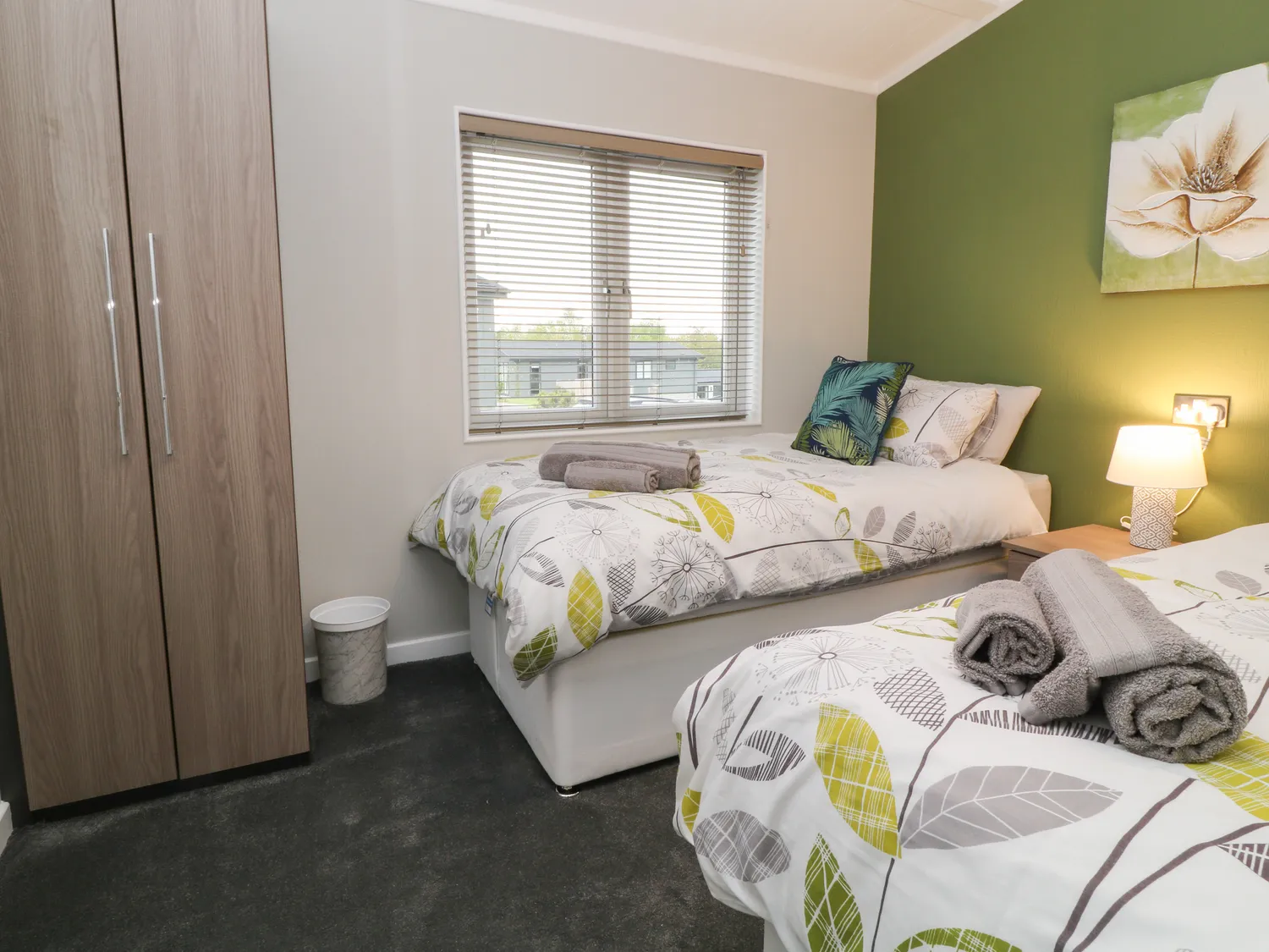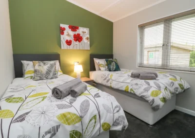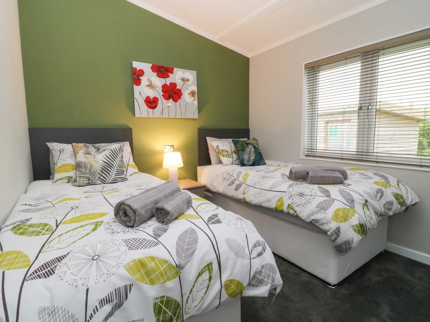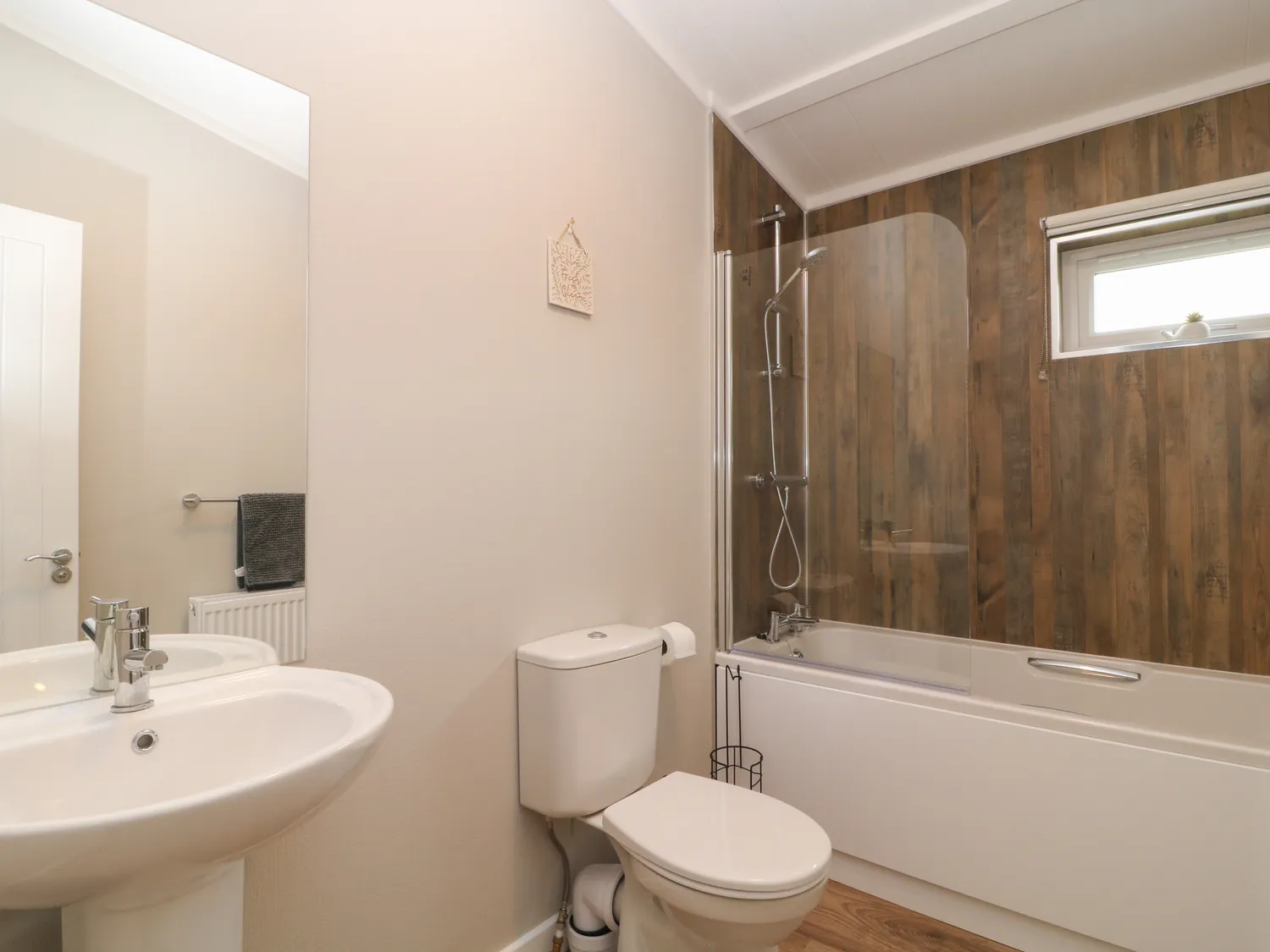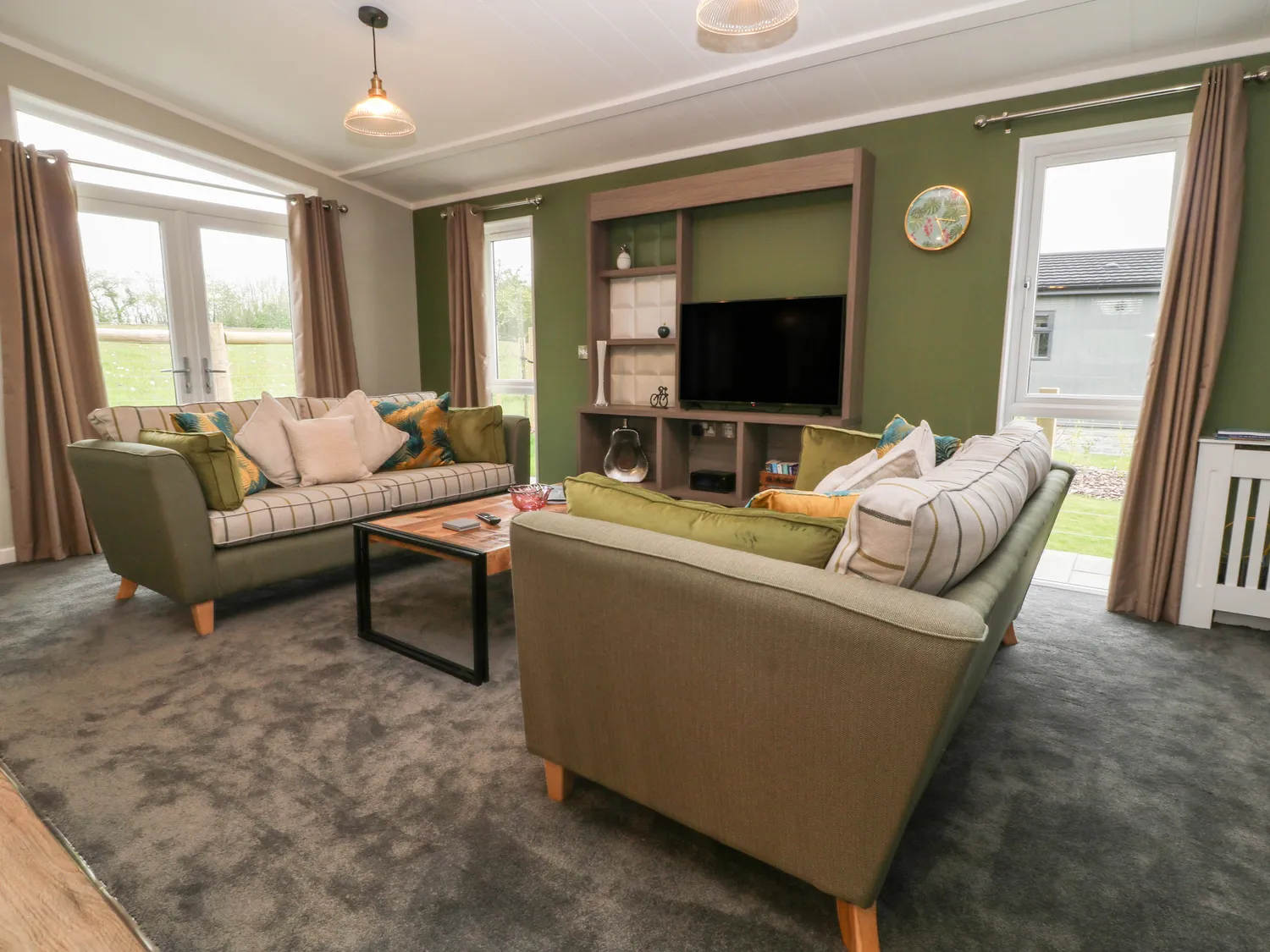 The lodge offers three well-presented bedrooms, all finished in calming, rural-inspired tones. The master double bedroom benefits from a TV, dressing table, and a stylish en-suite shower room, while two twin bedrooms are served by a contemporary family bathroom with bath and shower over.