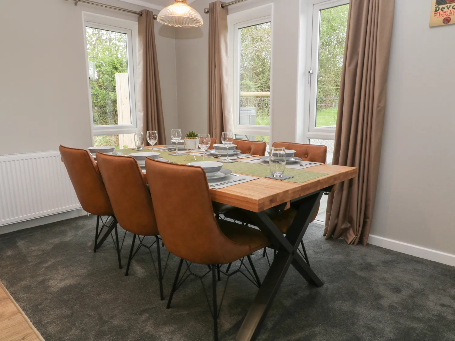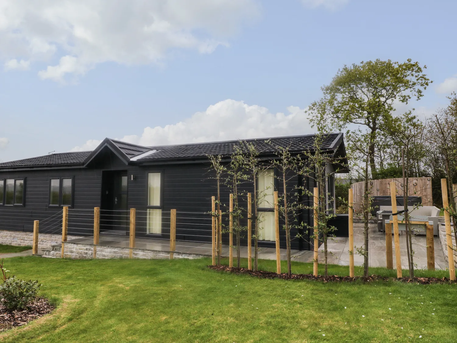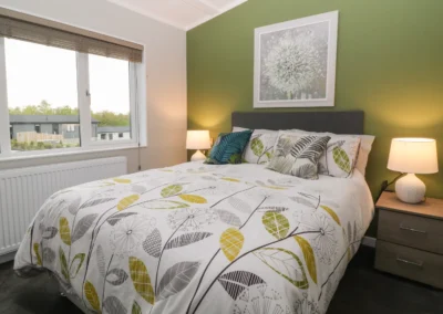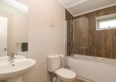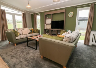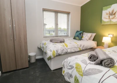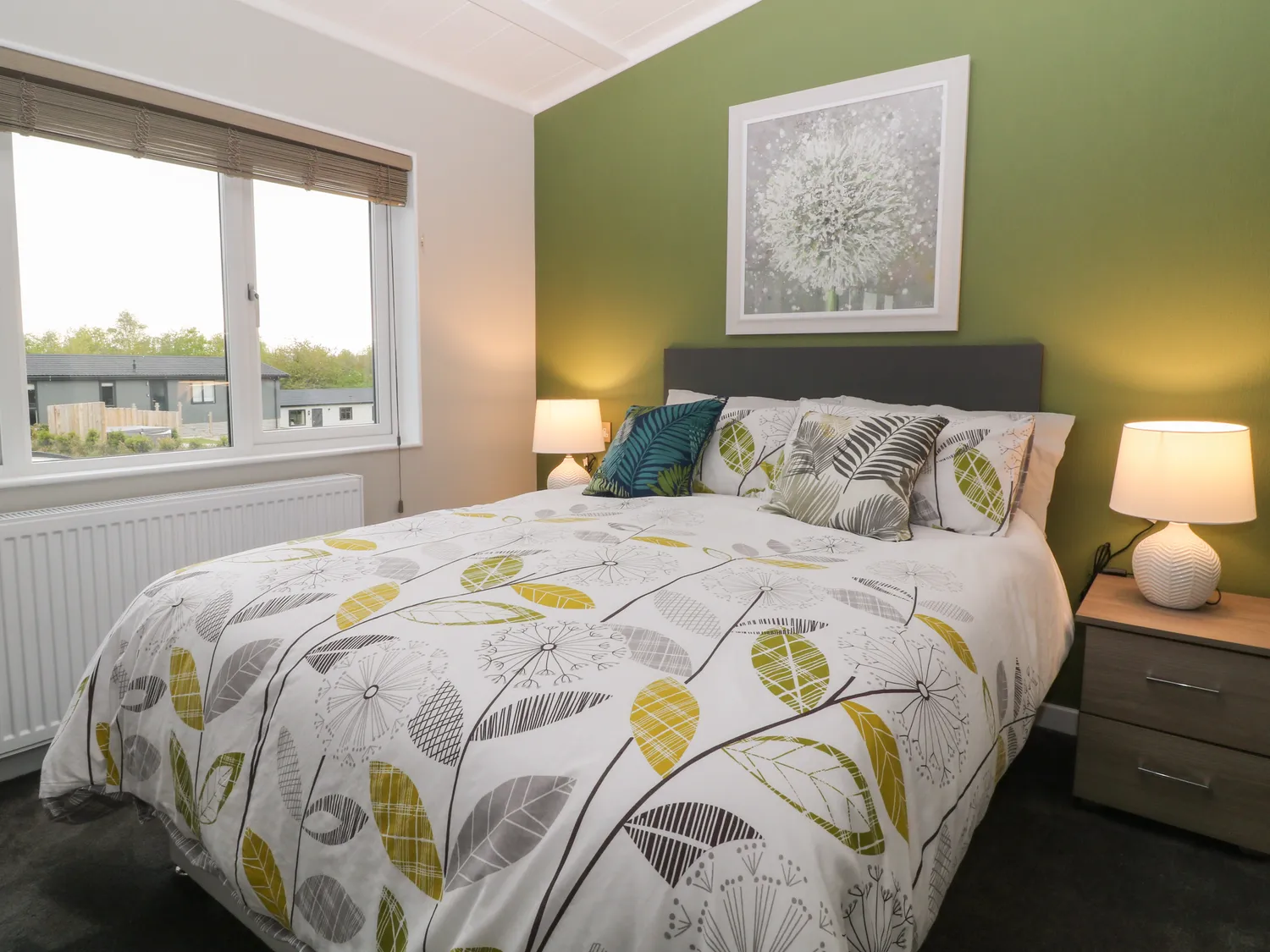 The lodge offers three well-presented bedrooms, all finished in calming, rural-inspired tones. The master double bedroom benefits from a TV, dressing table, and a stylish en-suite shower room, while two twin bedrooms are served by a contemporary family bathroom with bath and shower over.